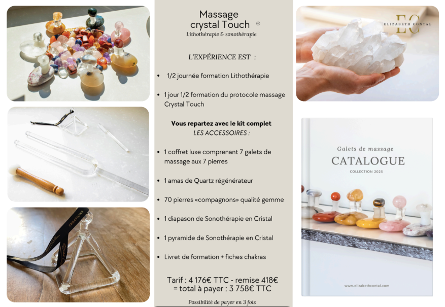 Elizabeth Contal transmet le massage signature Crystal Touch, un protocole exclusif intégrant Lithothérapie et Sonothérapie, destiné aux professionnels du bien-être souhaitant proposer un soin différenciant, profond et structuré.